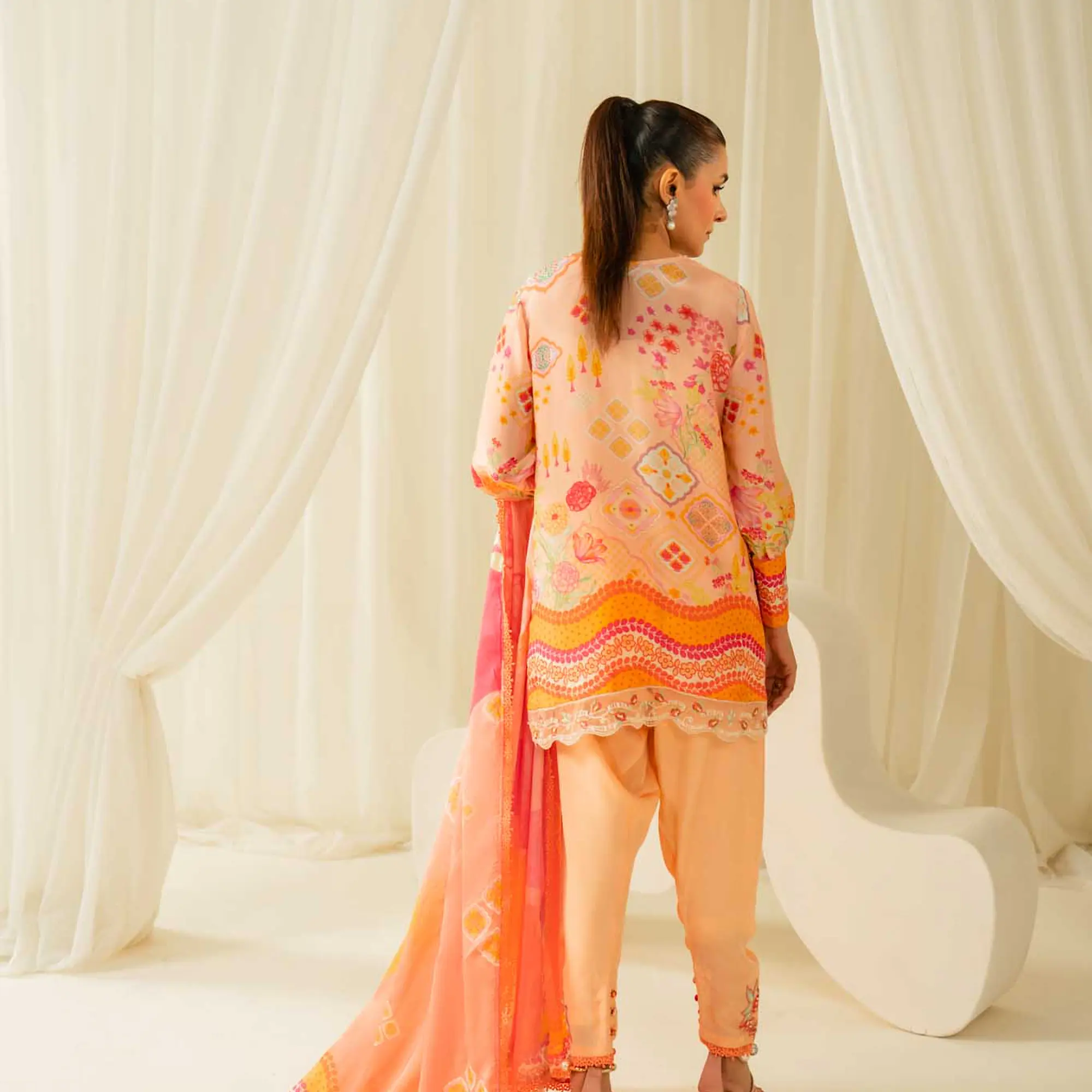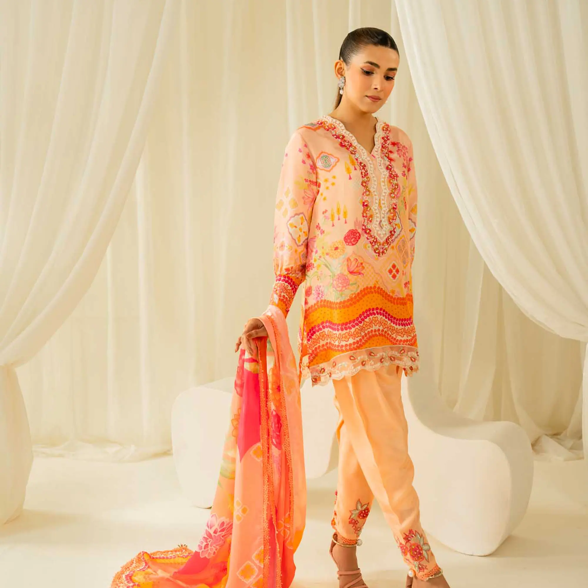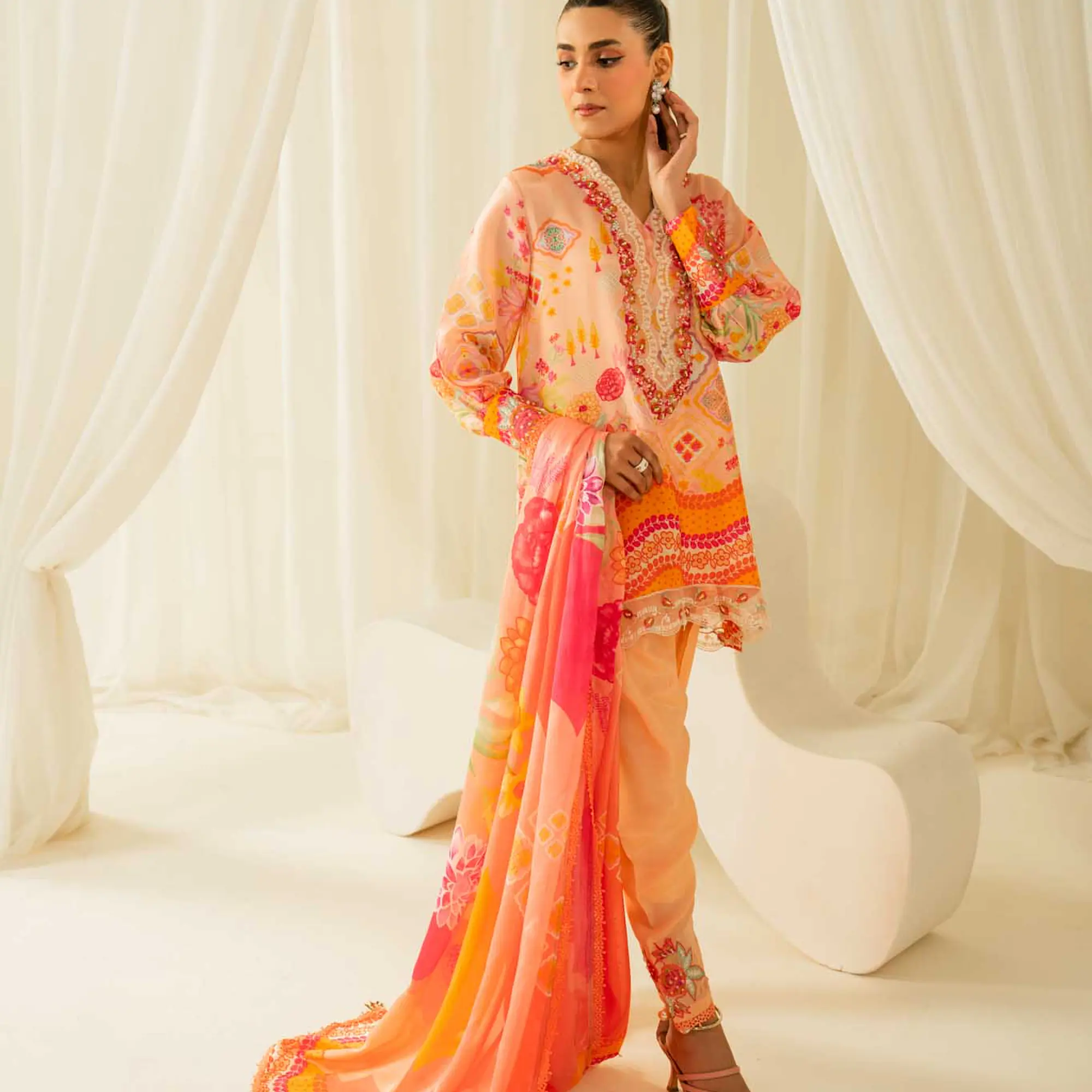 The outfit is completed with a statement printed dupatta, finished with delicate tassel details that add movement and charm.