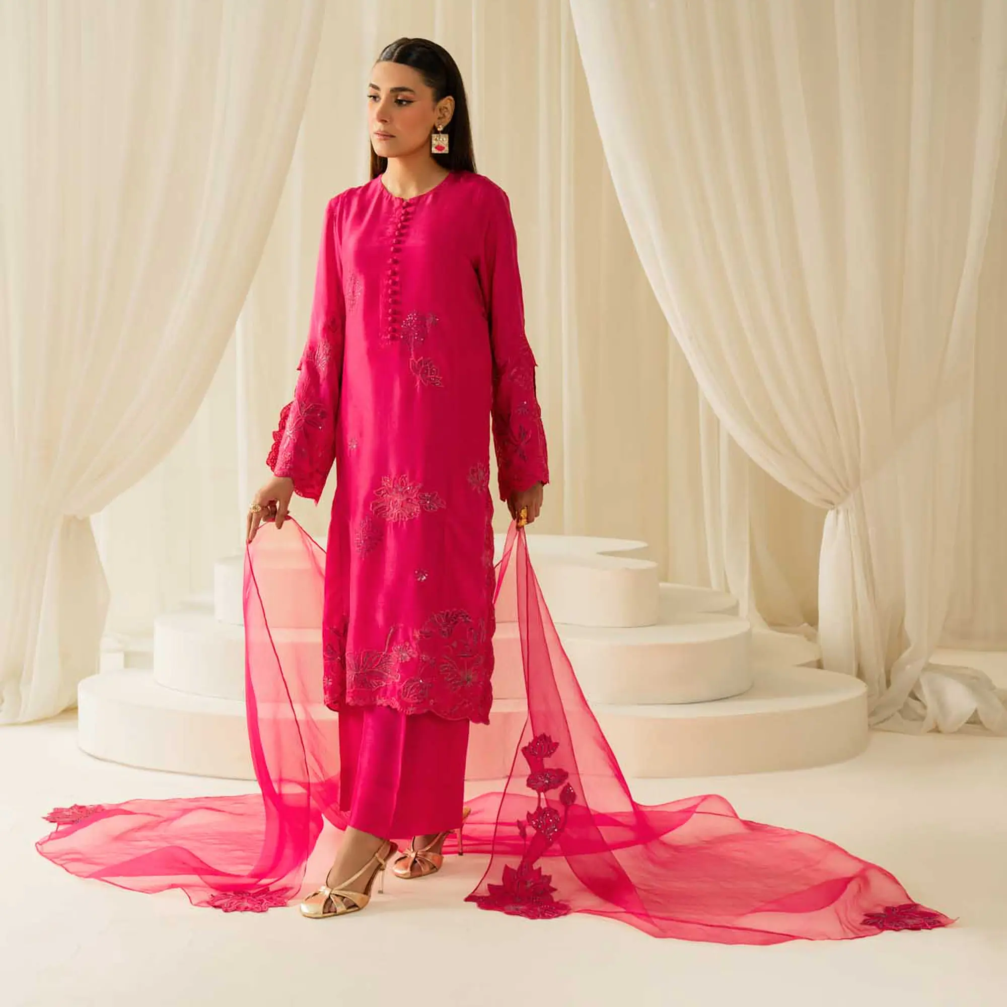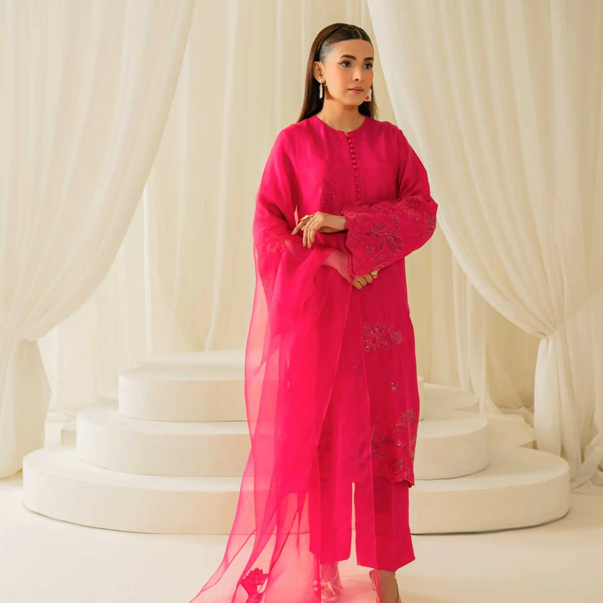 Fuchsia Desire is a refined three-piece ensemble crafted in premium pure silk and paired with a delicately embellished organza dupatta. Designed for modern festive dressing, it balances statement color with minimalist tailoring.