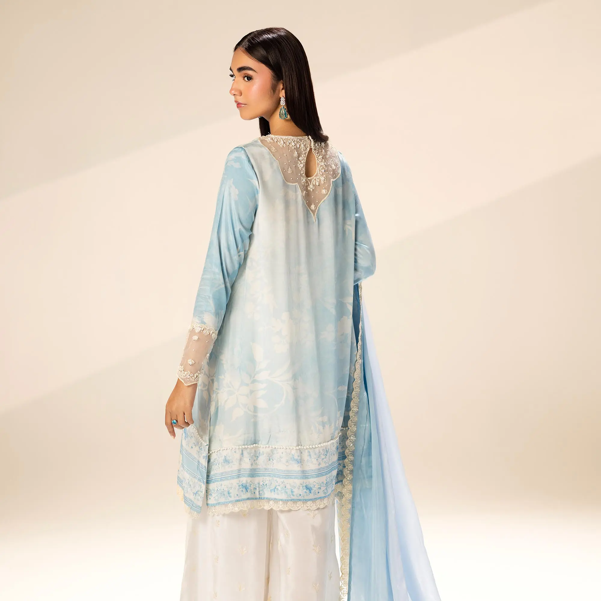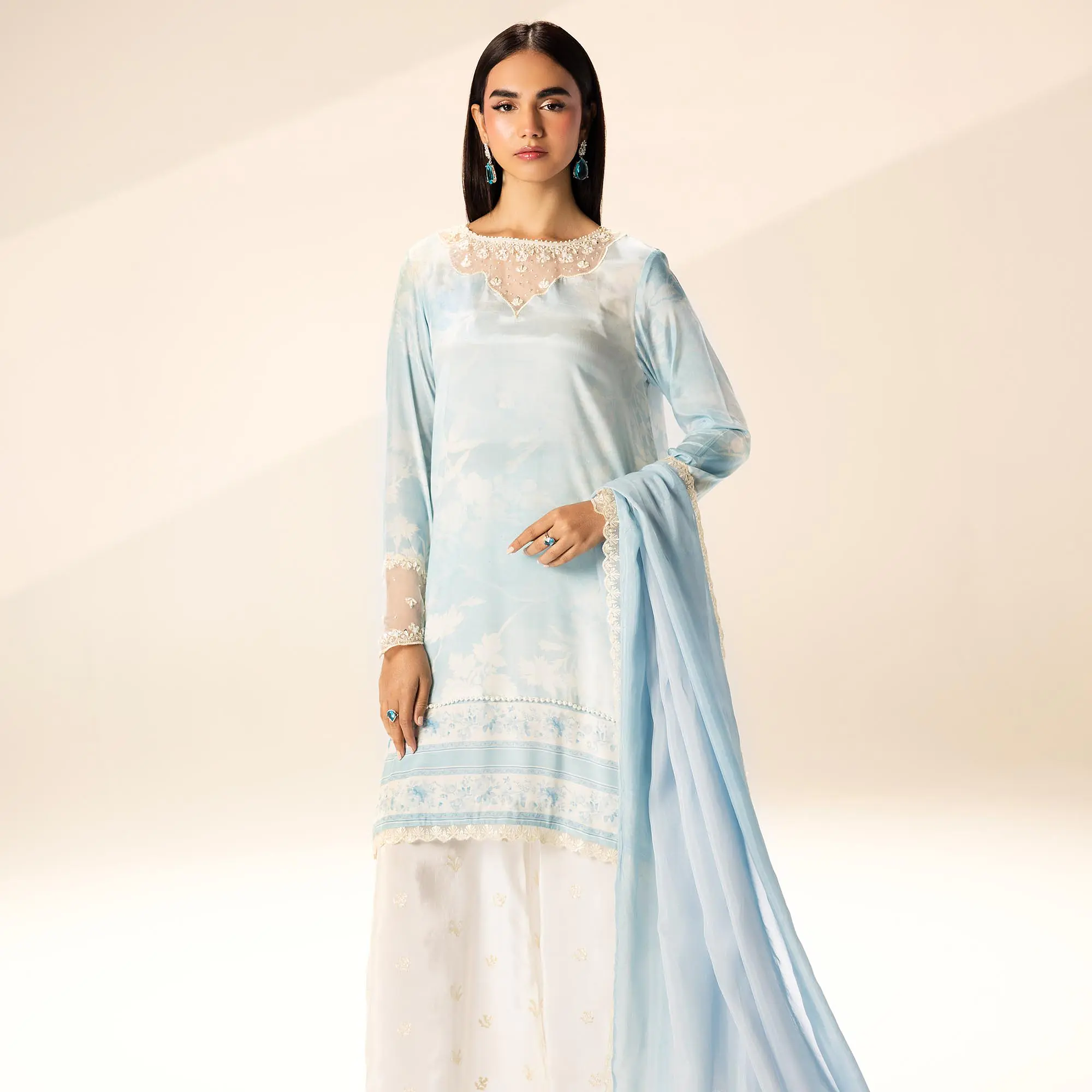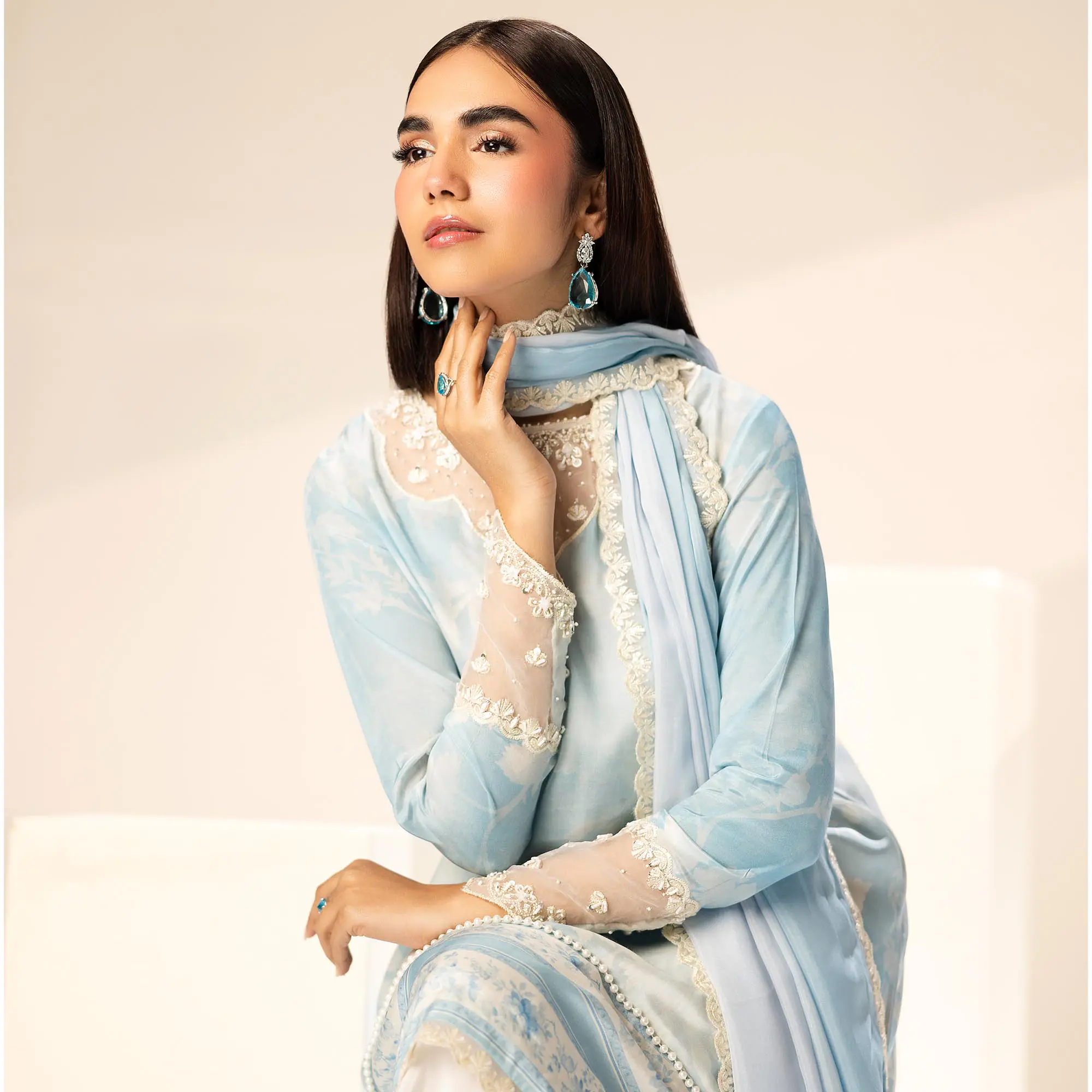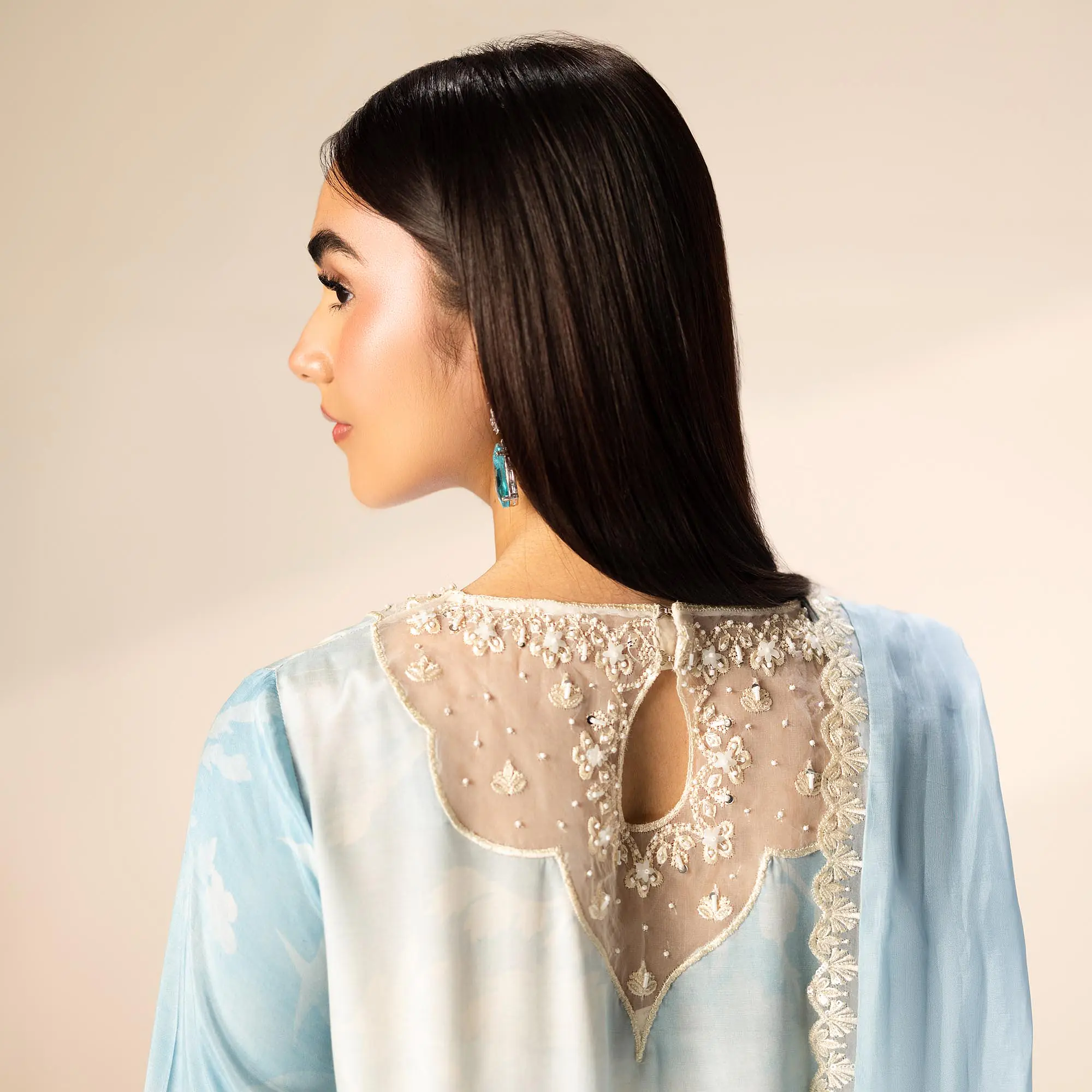 A serene blend of style and sophistication, this outfit features a printed pure silk canvas in soothing blue tones. Delicate handwork enhances the front, back, neckline, and sleeves, adding an artisanal charm. Paired with a pure medium silk ombré dupatta and flared, embroidered pants, this ensemble is a graceful choice for any elegant affair.