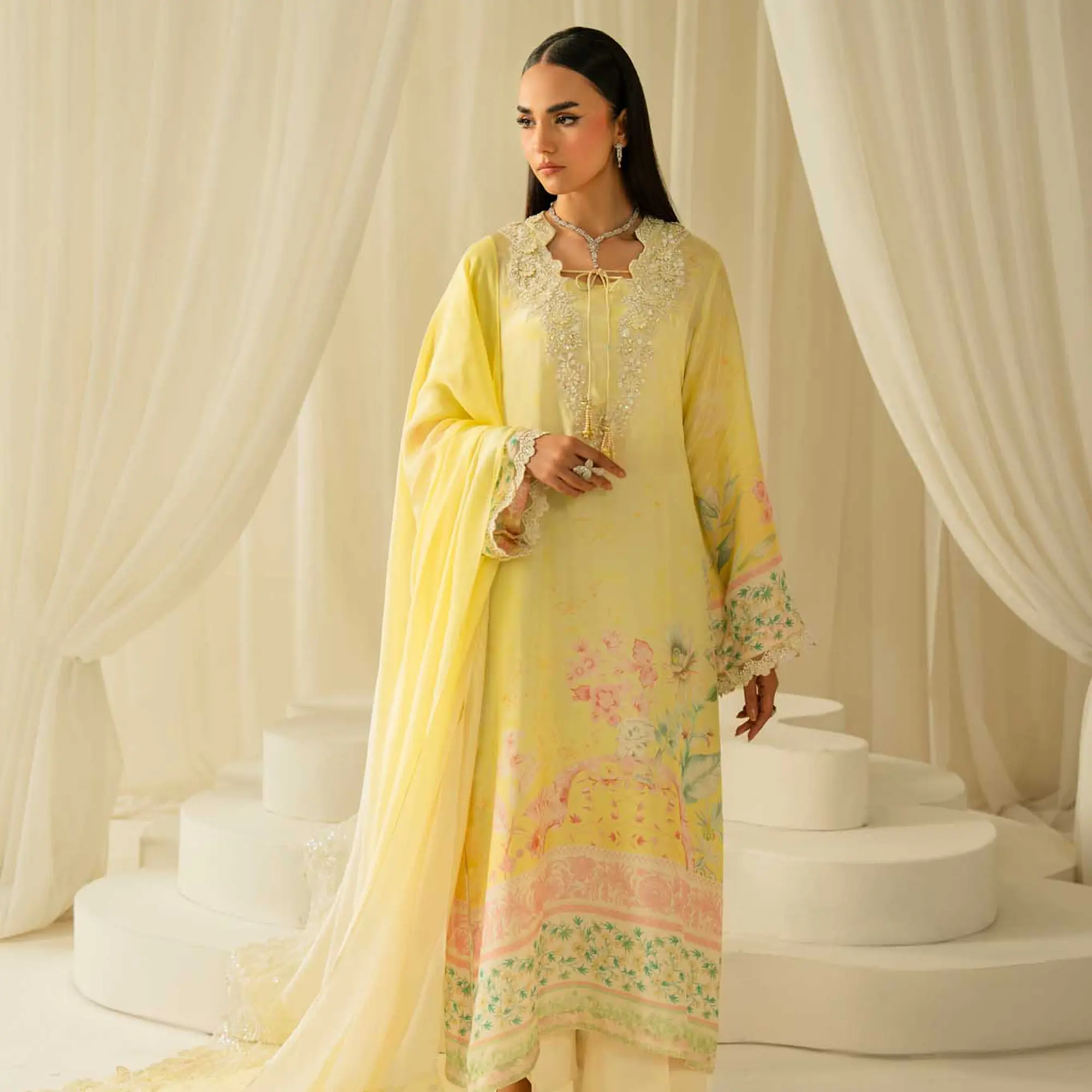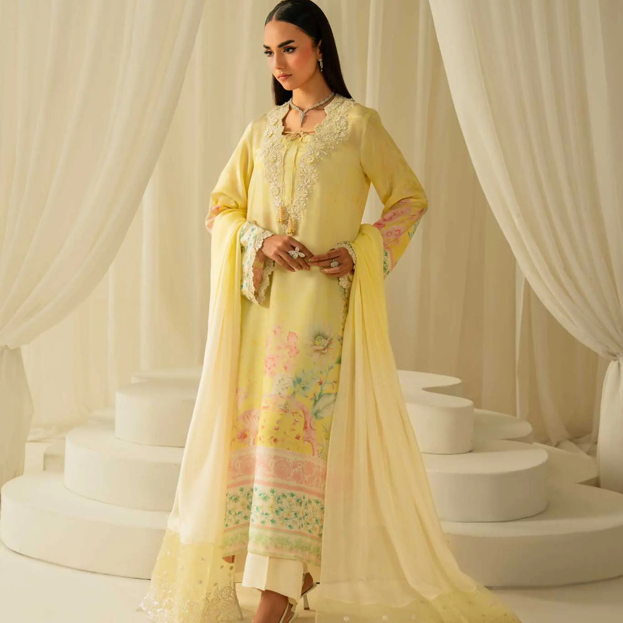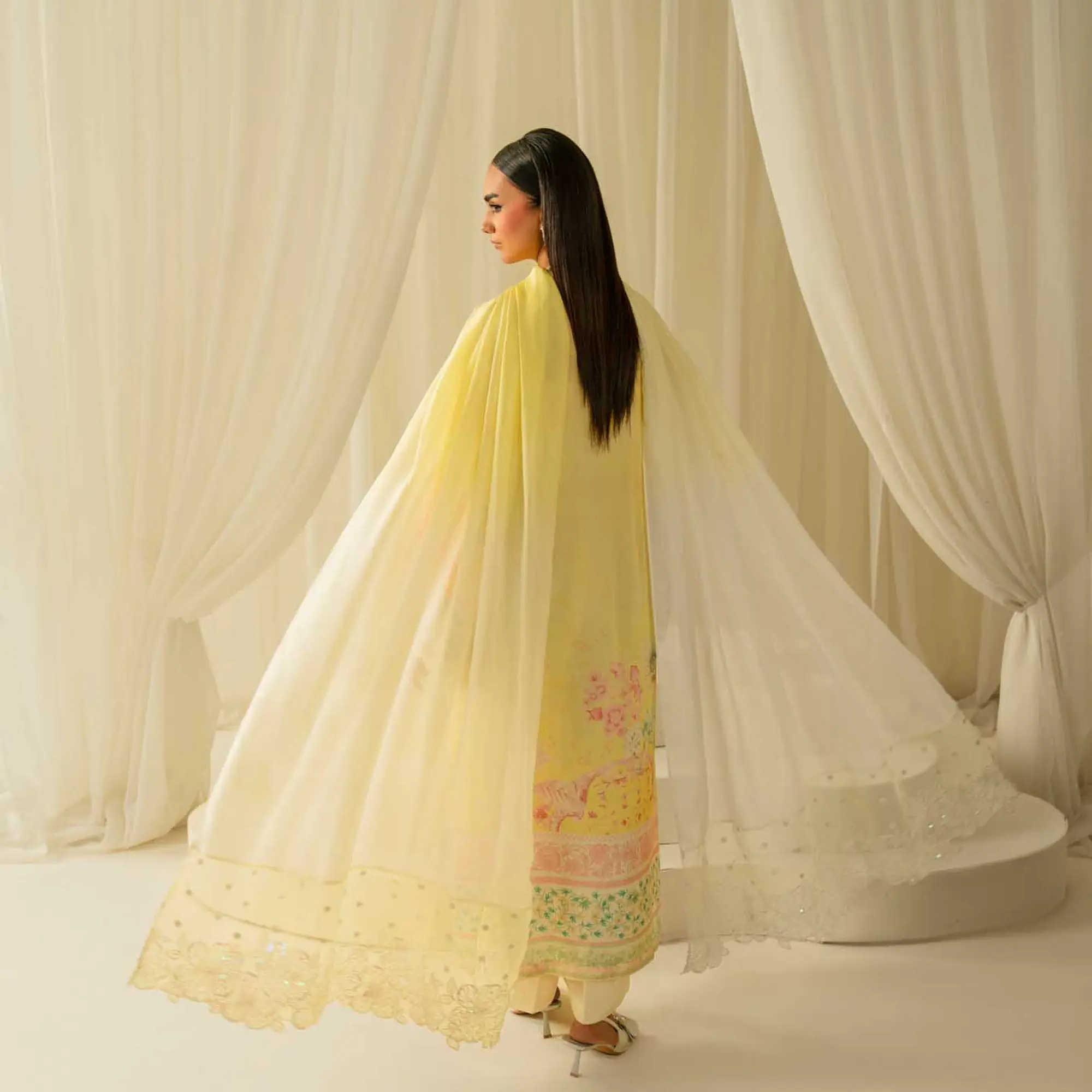 A refined festive ensemble crafted in luminous pure silk, designed with delicate detailing and a soft ombré finish.