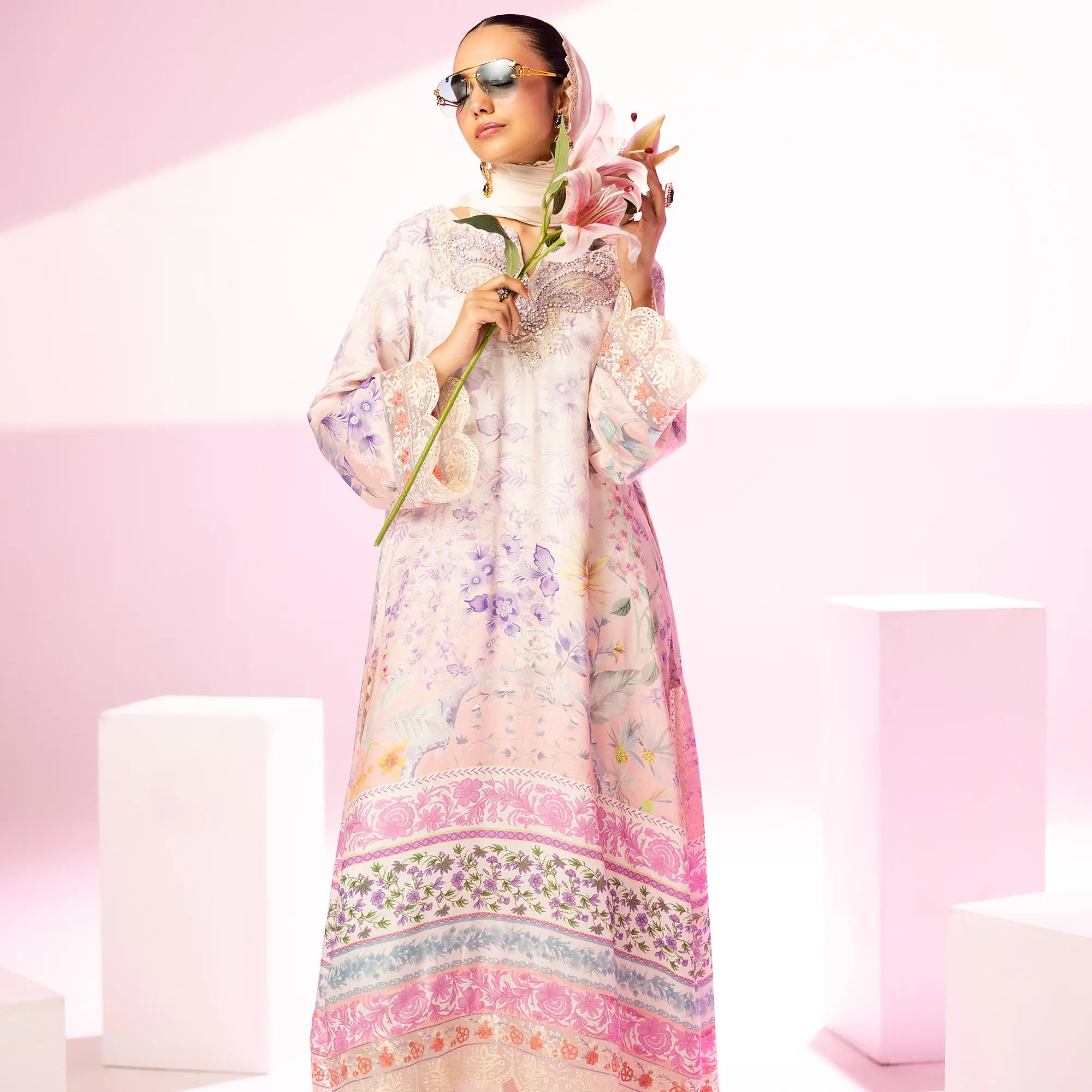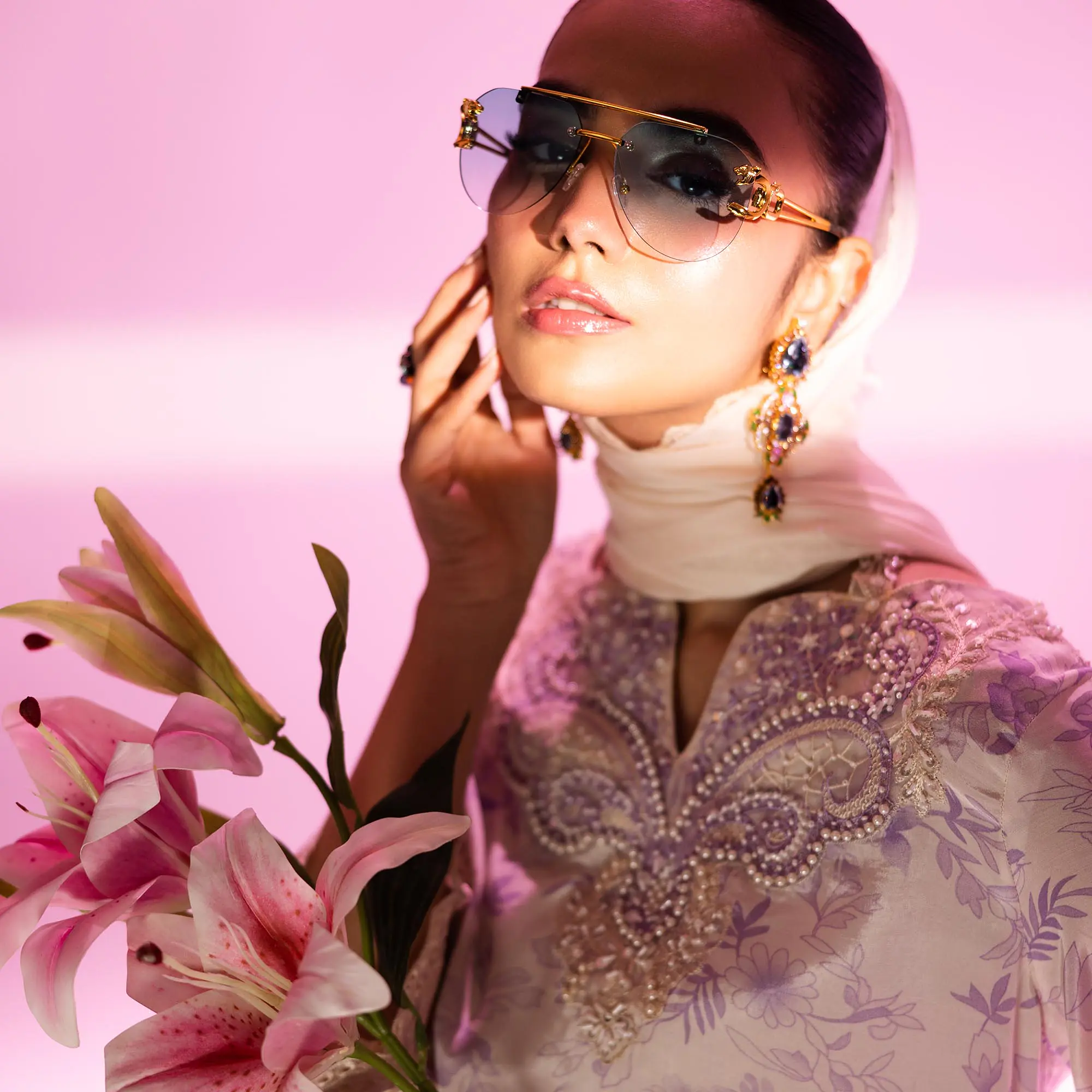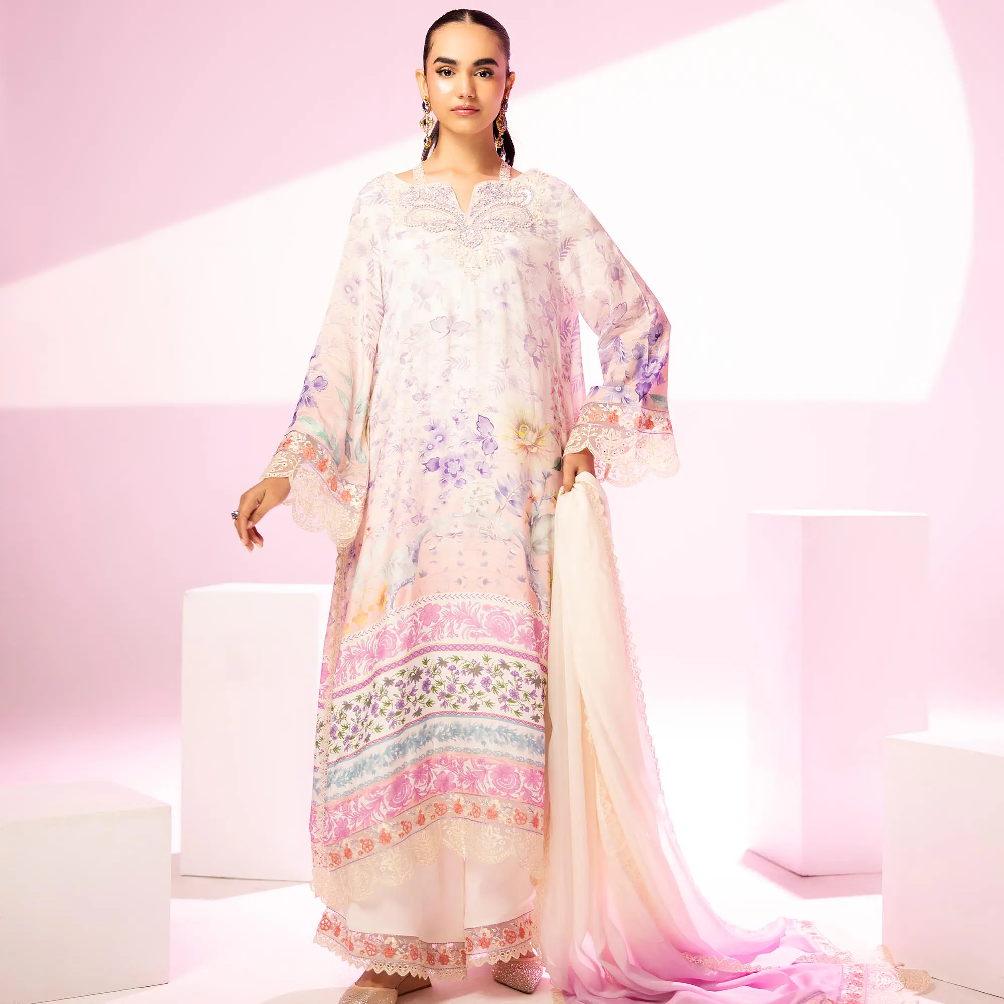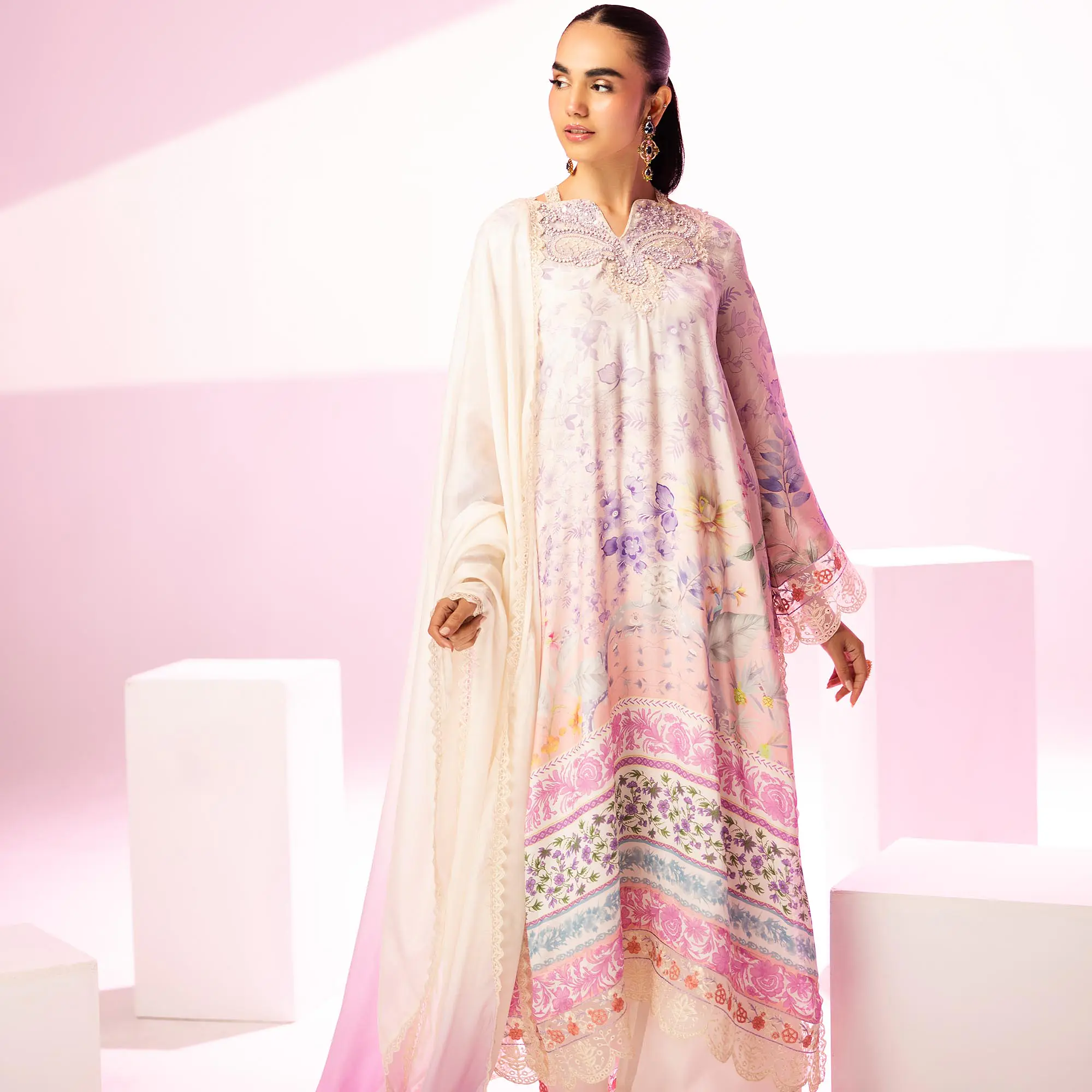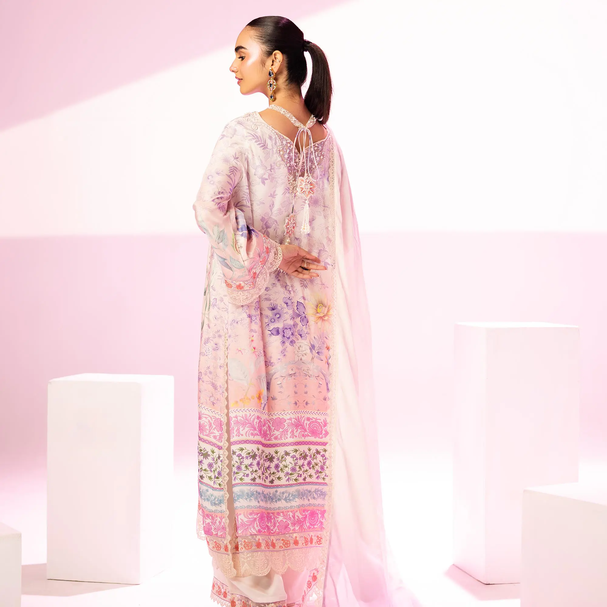 A delicate blend of soft lavender and pale pink on a printed canvas, Lily features intricate embroidery on the front, back, and neckline, accented with hand embellishments and tassel details. The hem and chalks are fully embroidered, adding graceful structure to the silhouette. Paired with a pure medium silk ombré dupatta finished with lace detailing and flared embroidered pants, this ensemble is an ideal choice for any formal occasion.