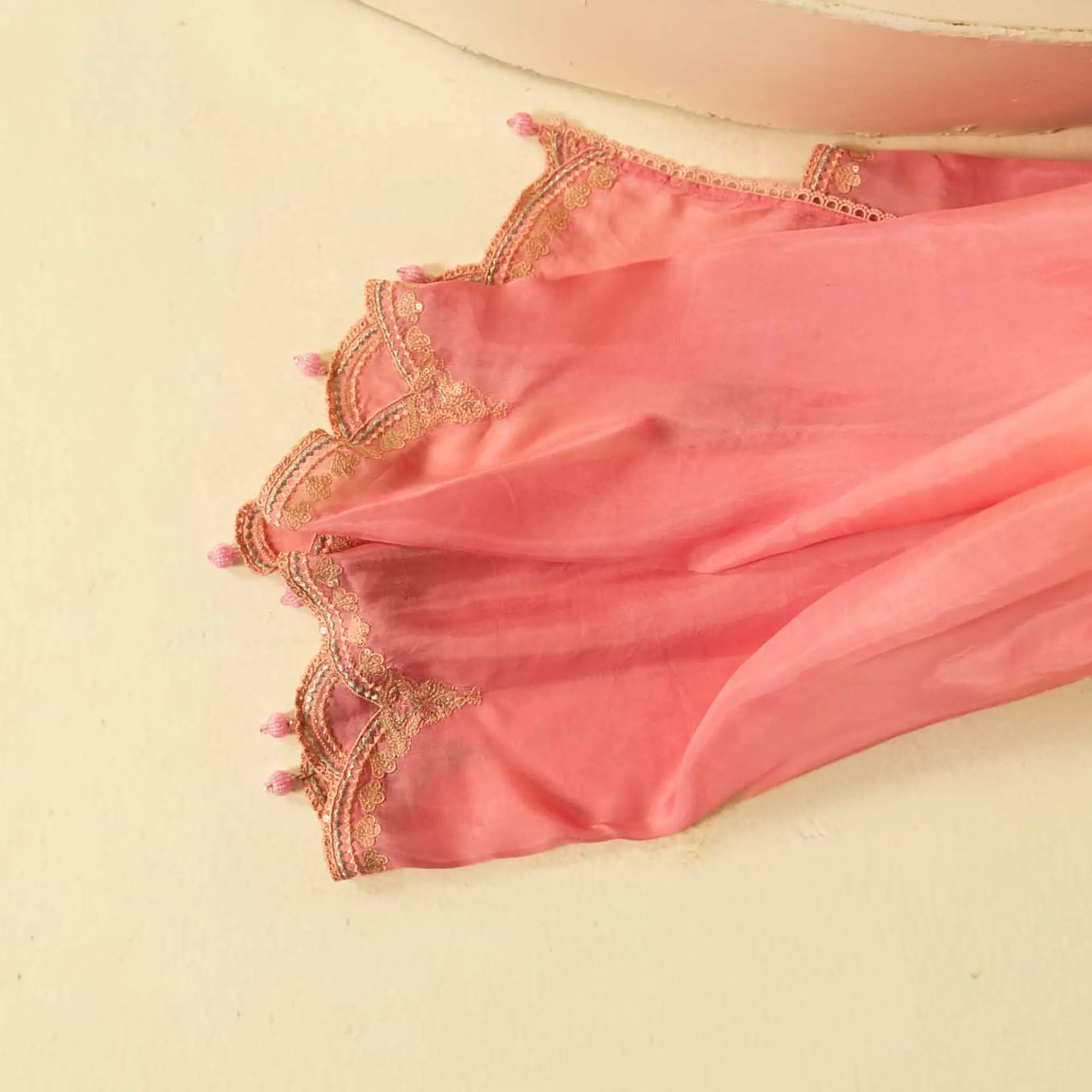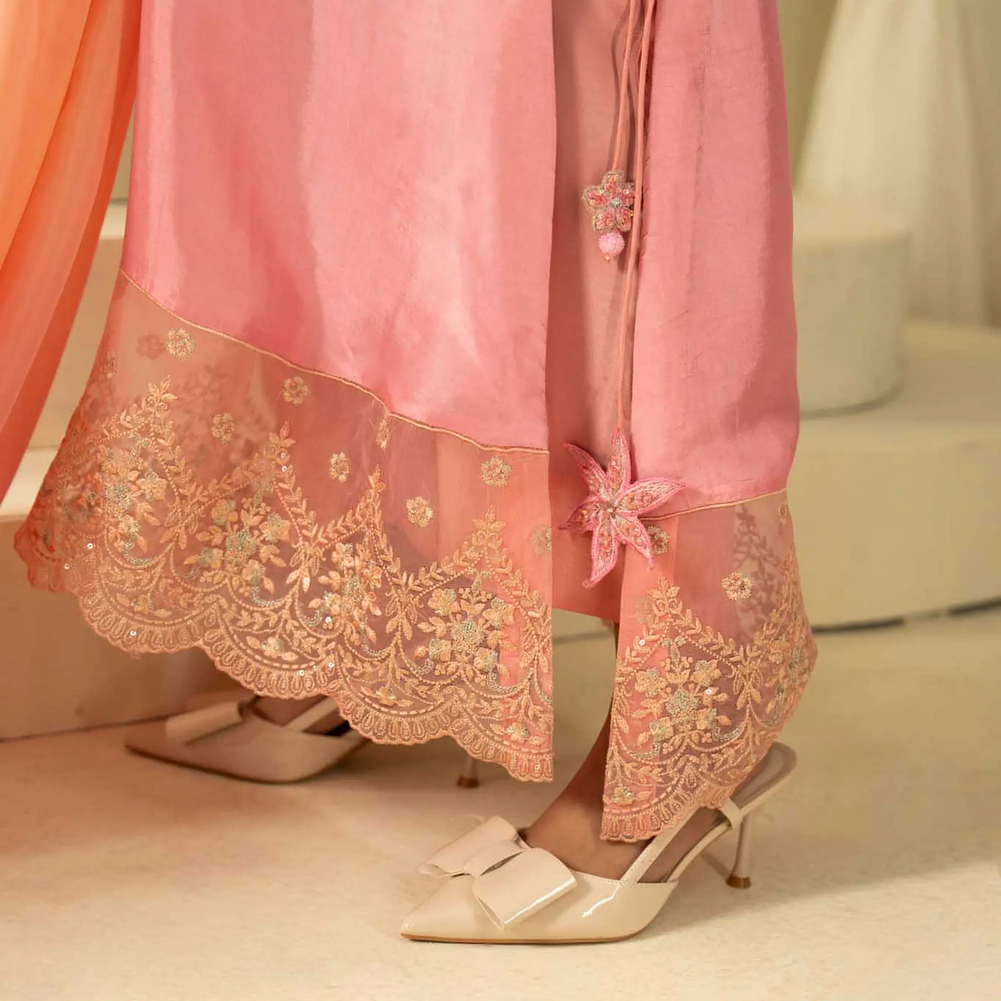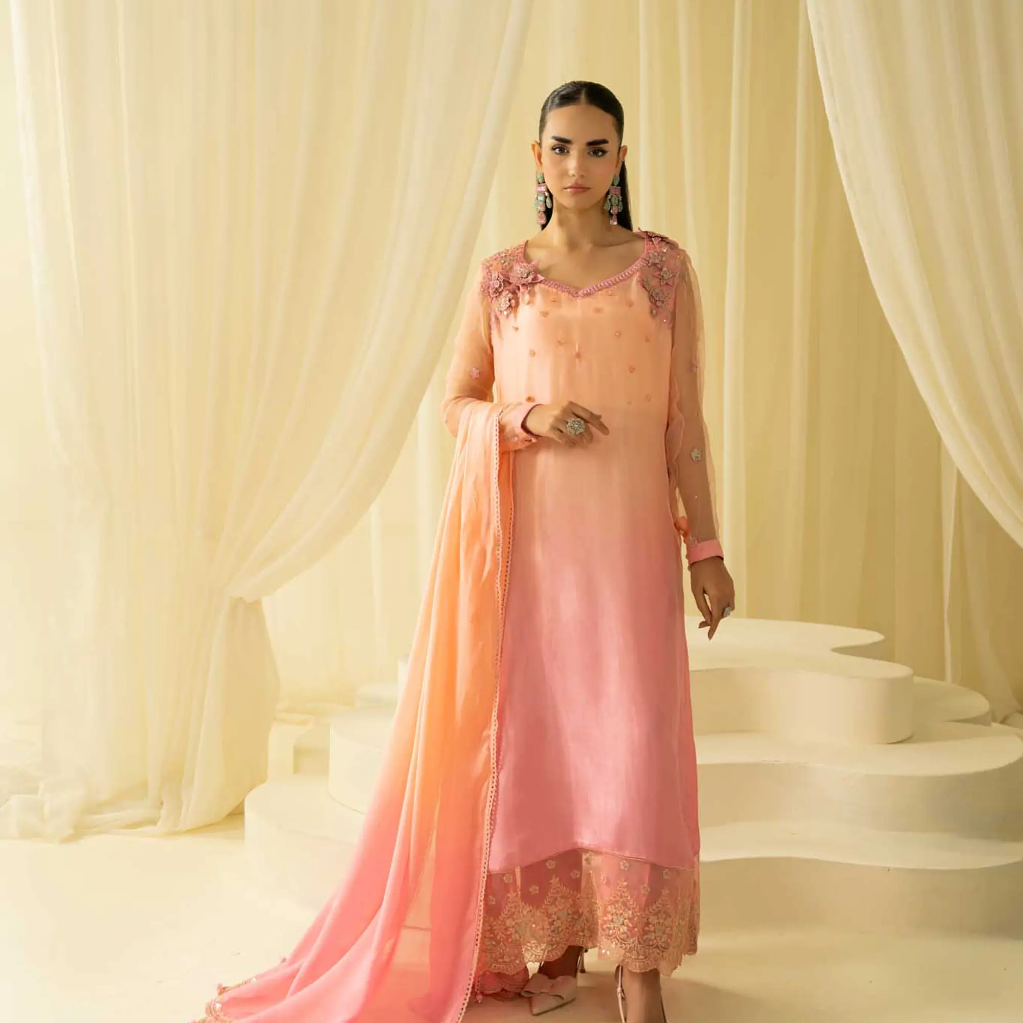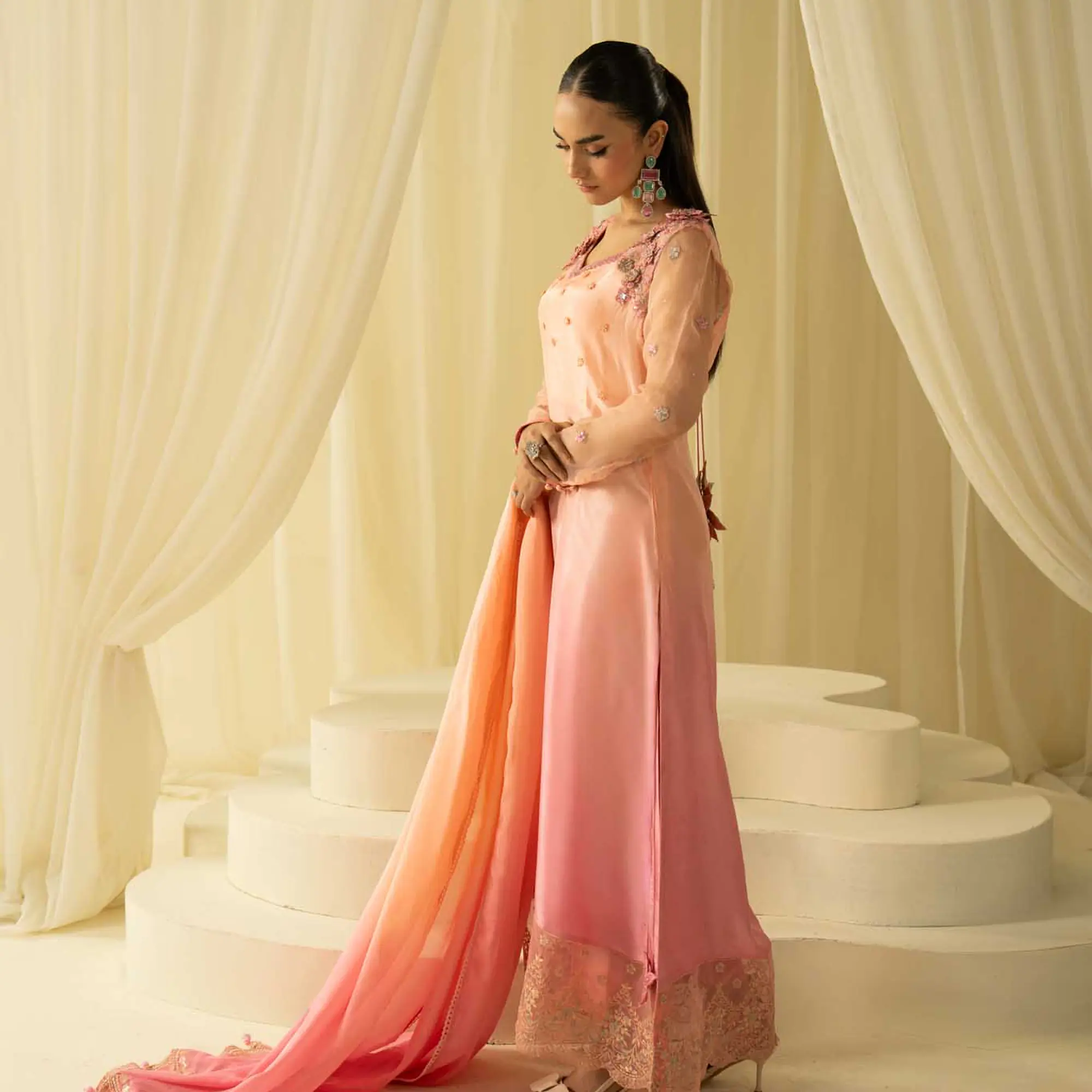 An elegant three-piece ensemble crafted in premium pure silk, featuring a soft pink-to-peach ombre finish and intricate hand detailing.