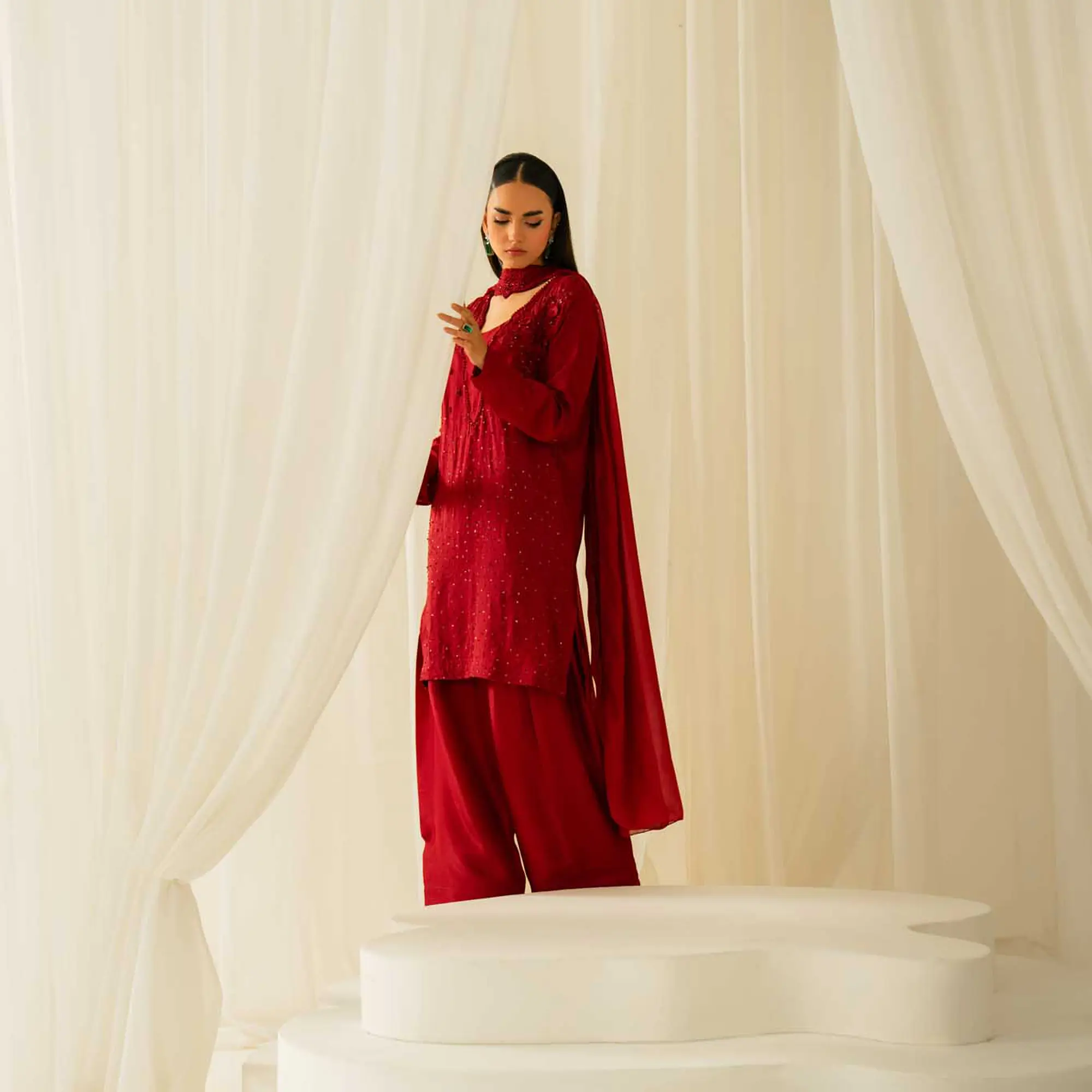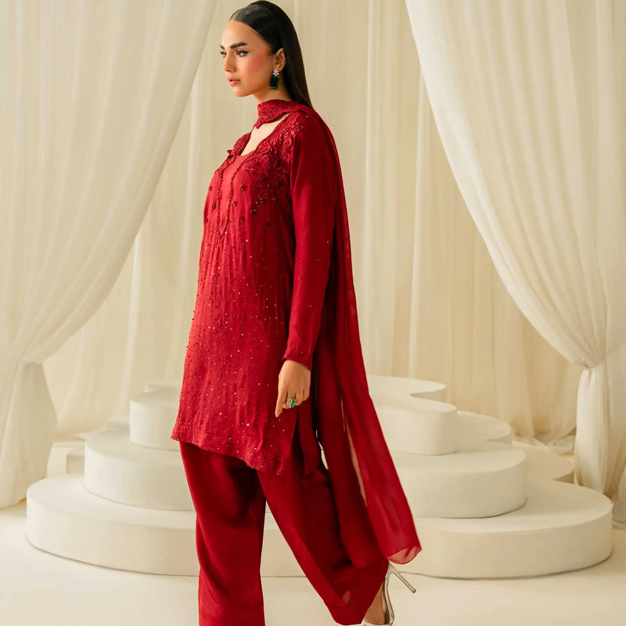 Elevate your festive wardrobe with the Ruby Three-Piece Set, crafted from luxurious pure silk in a rich ruby red tone. Designed to make a statement, this ensemble features heavy embellishment and intricate detailing that adds depth, texture, and couture-inspired elegance.
