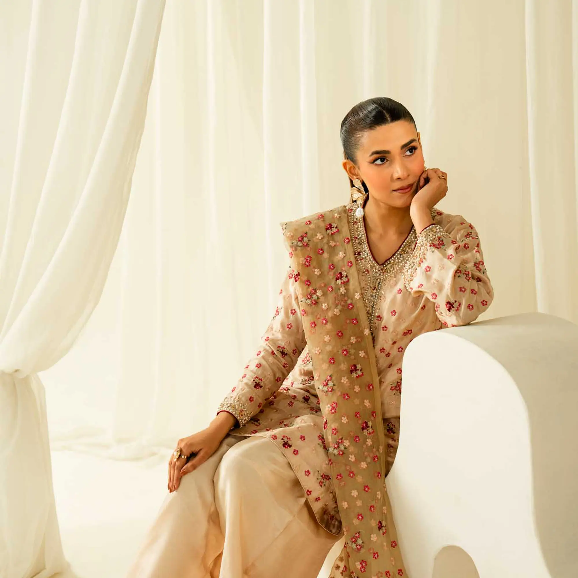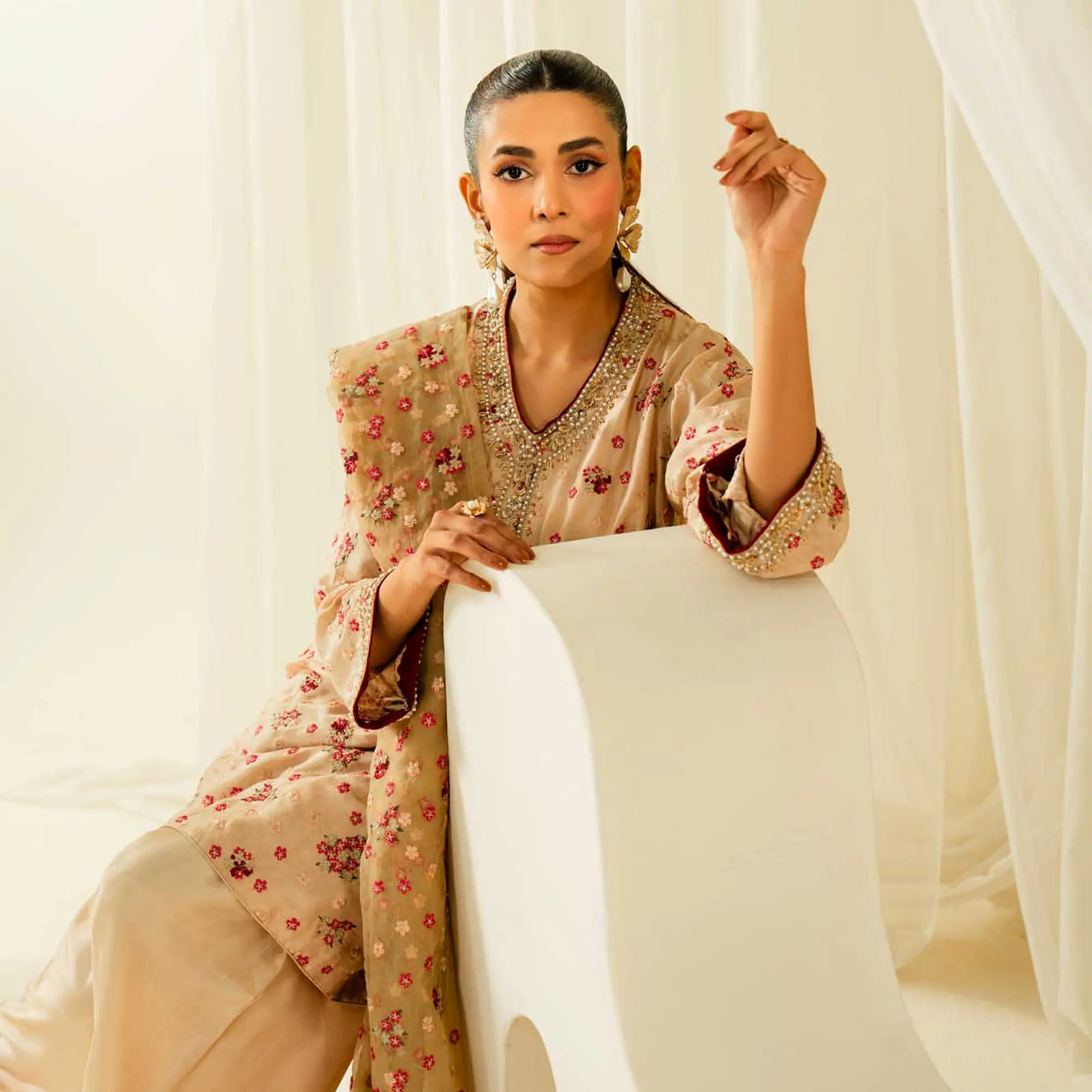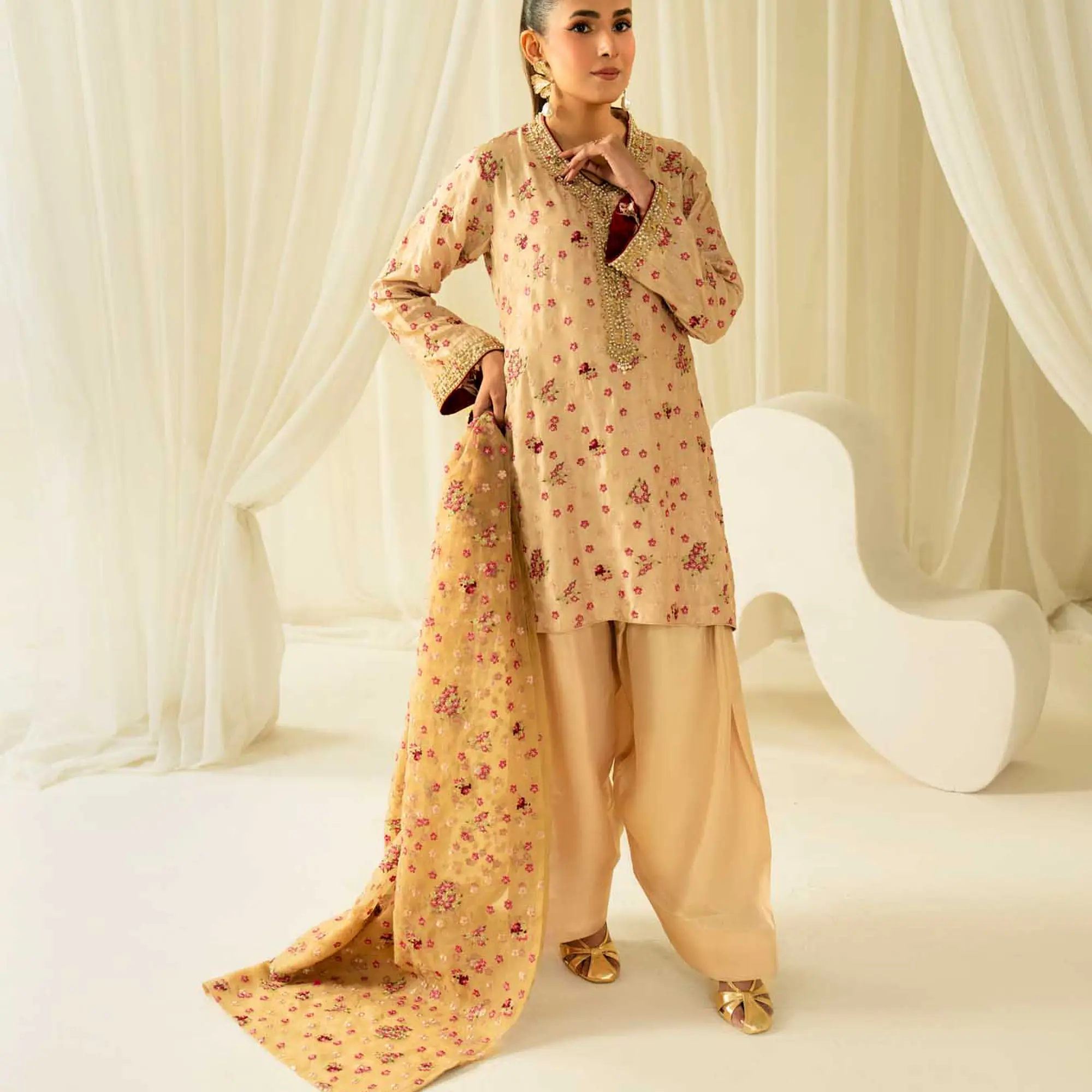 An elegant three-piece ensemble designed in a timeless vintage rose hue, combining intricate embroidery with refined hand detailing for a graceful, occasion-ready look.